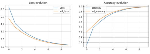 As we can see from the plots above, the model showed quick growth as the number of epochs increased and was able to achieve a near perfect accuracy towards the end. It finished with a 99% accuracy.