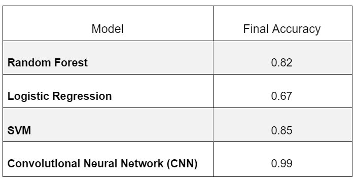 As we can see, CNN performs best, followed by Random forest, then SVM and finally logistic regression.