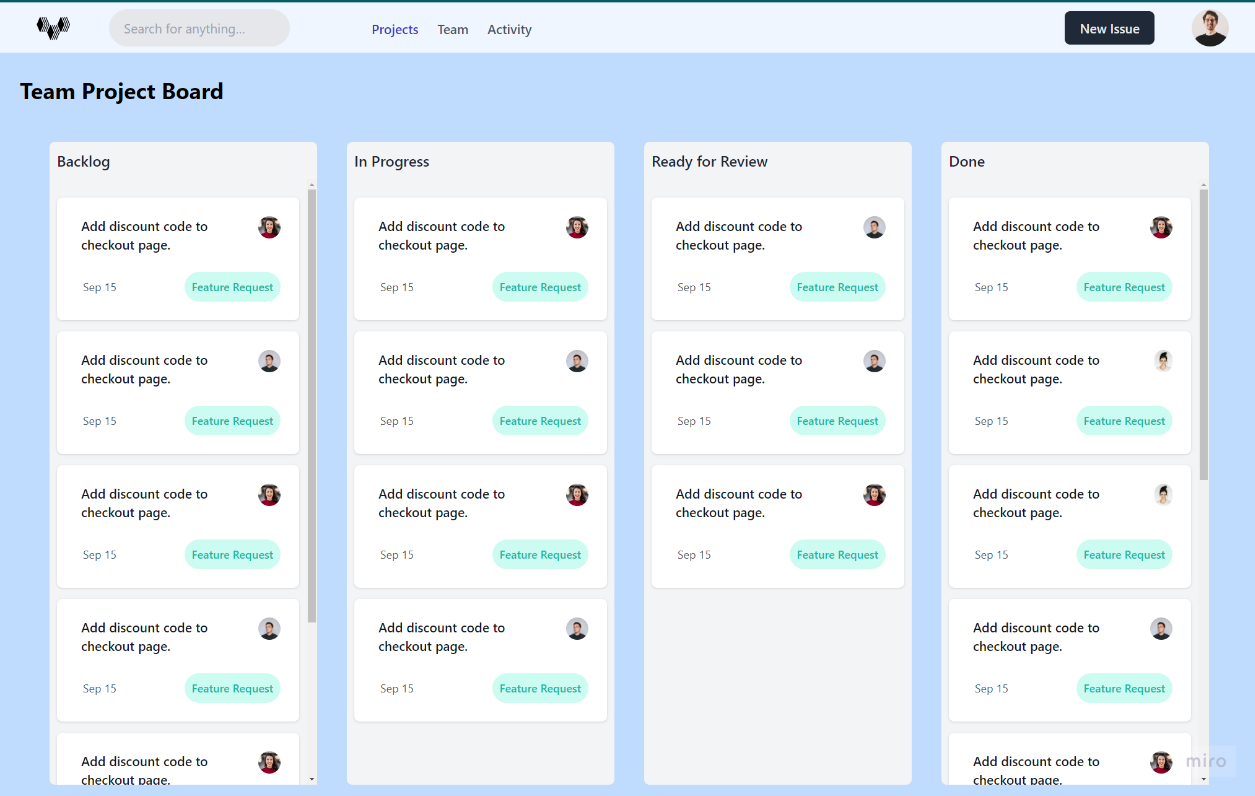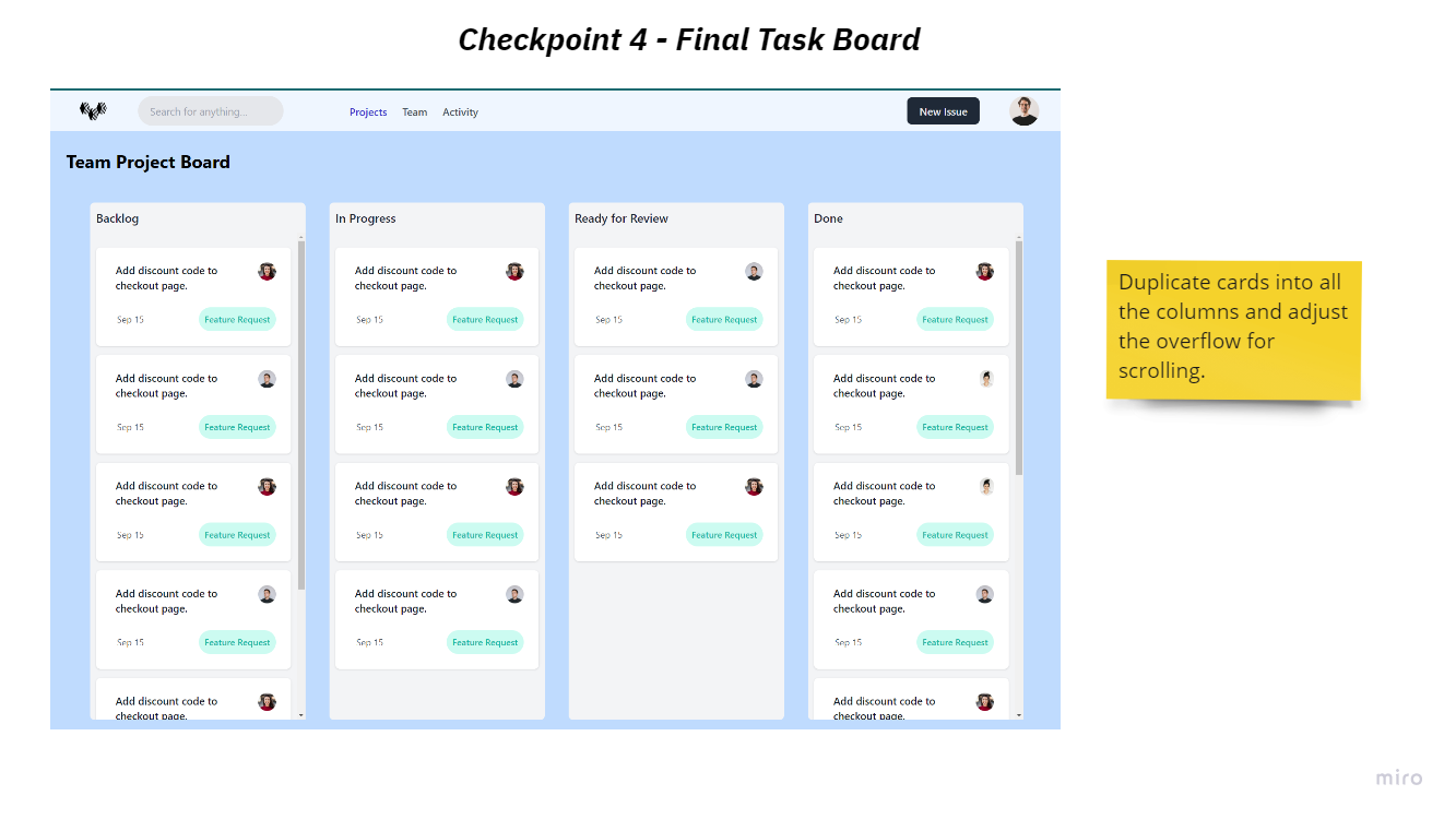 This challenge expects to create a Task Board. It is the layout and appearance that is important, not functionality. The page does not have to be responsive.
