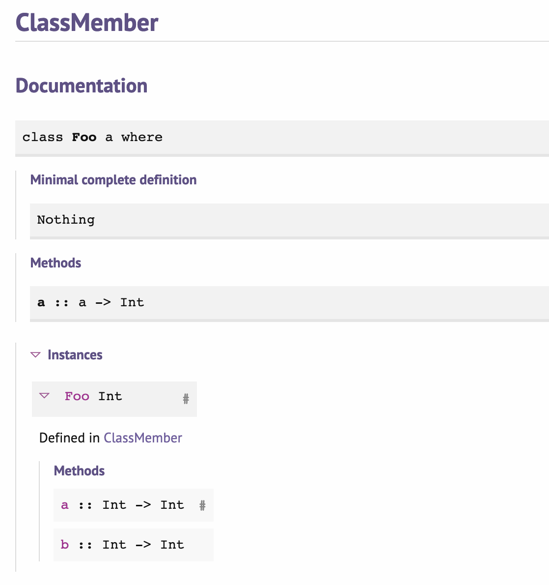 b has no business showing up in the instance! I expect this problem shows up for instance lists under data declarations. Although this example has an obviously correct case, it is not always clear what we should do. For instance: suppose a class is exported from two different locations with different methods visible, which do we show