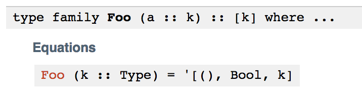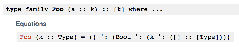 We reconstruct promoted list literals whenever possible. That means that 'synifyType' produces '[Int, Bool, ()] instead of (Int ': (() ': (Bool ': ([] :: [Type]))))