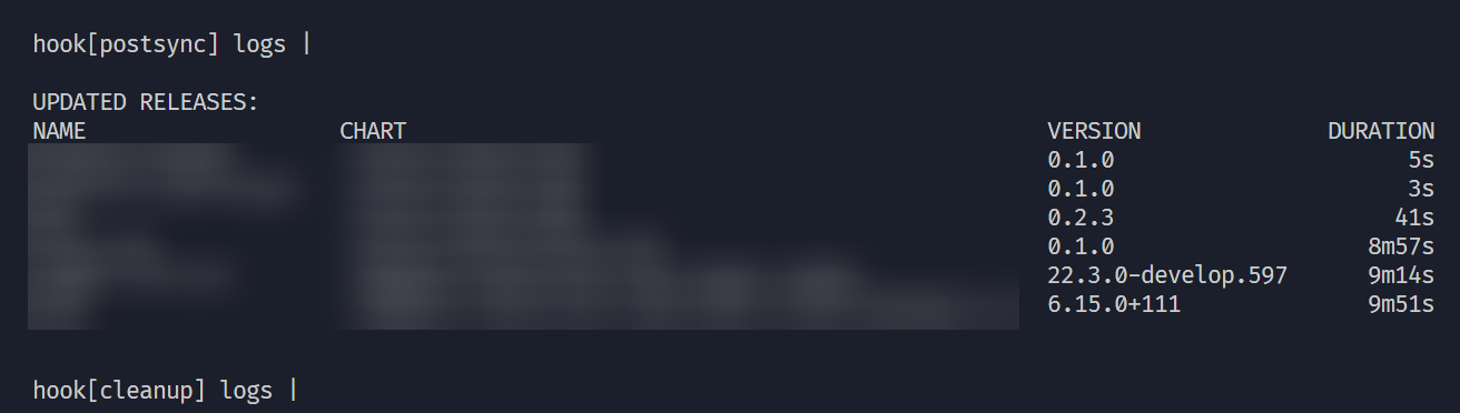 The purpose of this feature is to show the duration it took to update or delete each release when a sync, destroy, or apply command is called. Below are some examples: