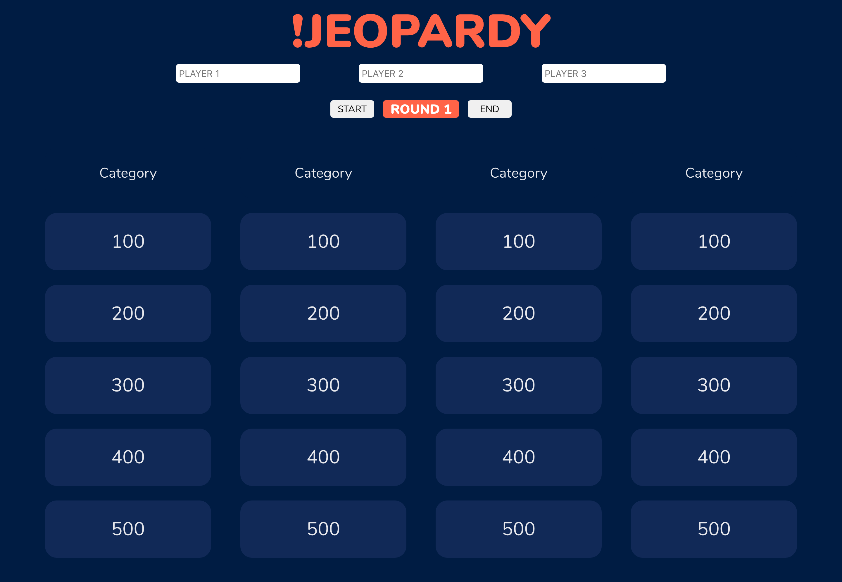 Jeopardy - Pair Project A three player game for jeopardy enthusiasts to battle their friends to see who could be the next Ken Jennings. Contributors Elly Tores - Github profile Hill Stewart - Github profile DTR Original assignment
