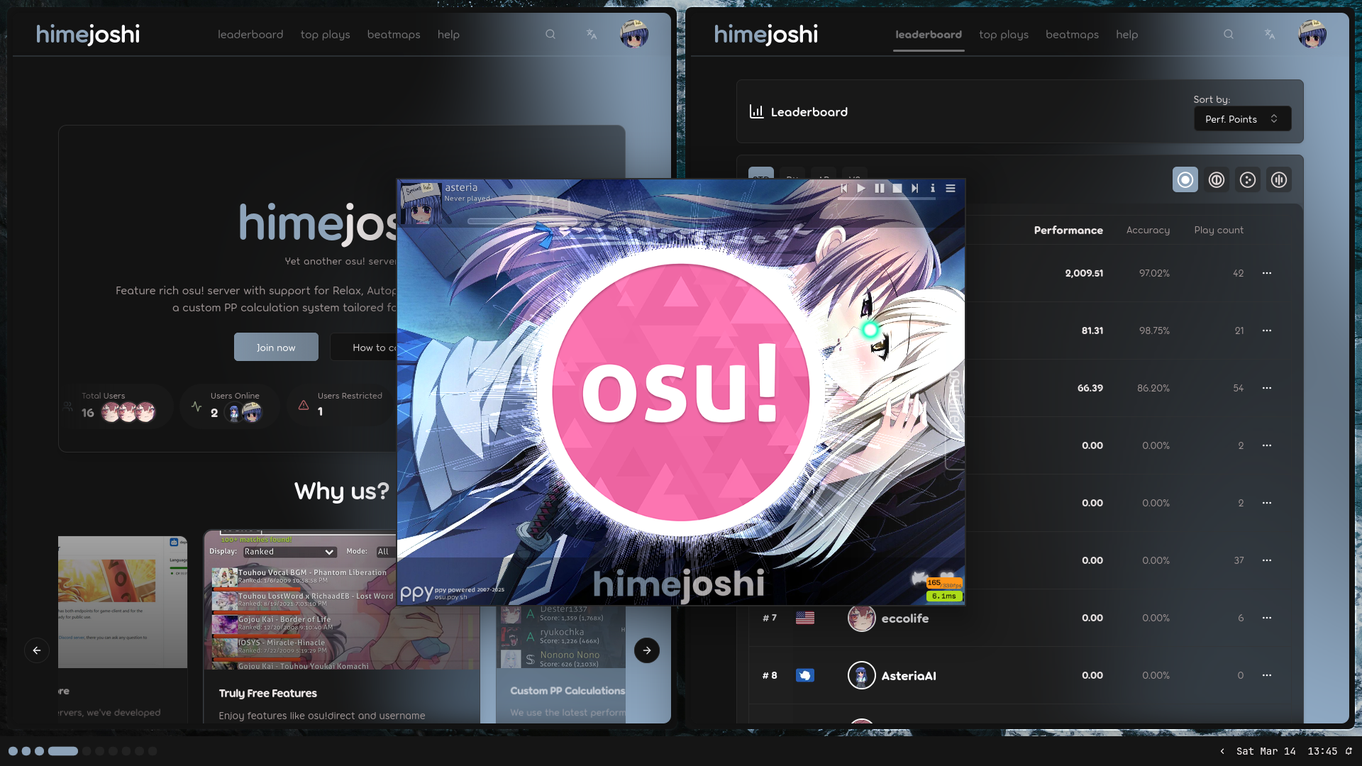 Himejoshi is an enhanced distribution and fork of the Sunrise osu! private server framework. Our goal is to extend the core Sunrise ecosystem, adding exclusive new features and refining the player experience for a more polished community environment.