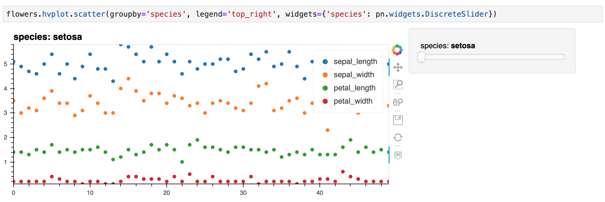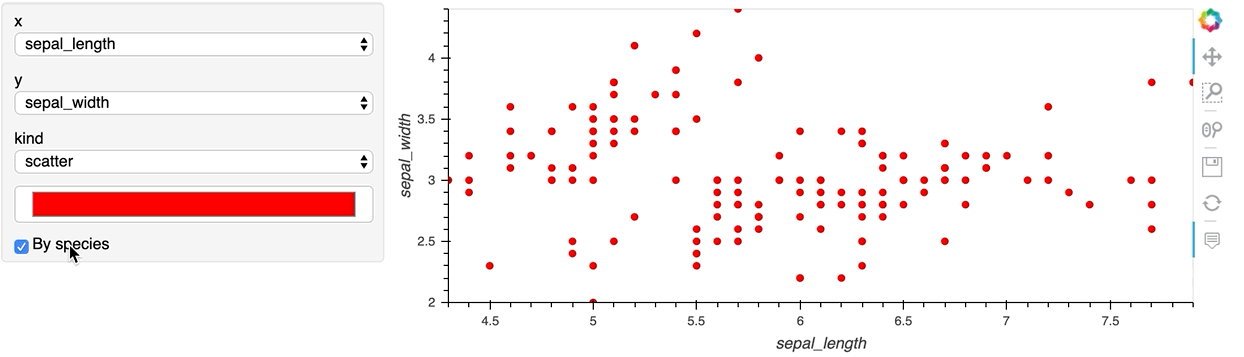 by_species_fnreturns either the 'species' column or theColorPickerdepending on whether the checkbox is ticked, making it simple to specify even complex behaviors.Currently this re-renders the plot every time a parameter changes. A future exercise can be to optimize this by handling certain parameters internally using DynamicMaps.