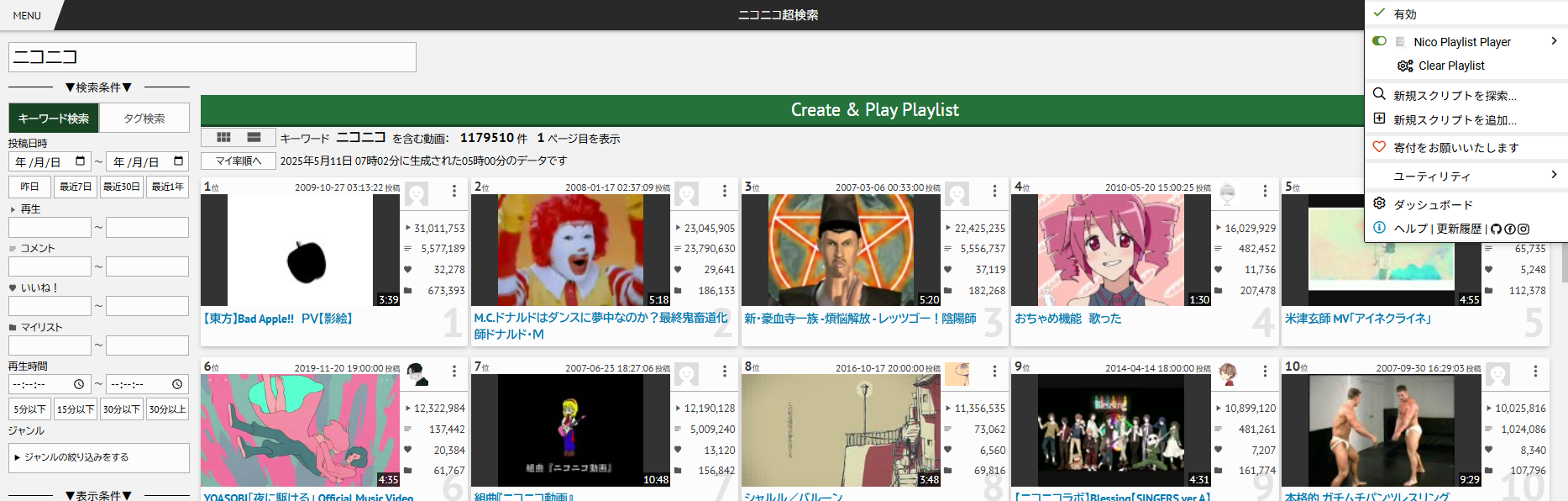 ニコニコ超検索の検索結果から動画のプレイリストを作成し、ニコニコ動画で連続再生します。拡張機能のメニューからプレイリストを空にできます。