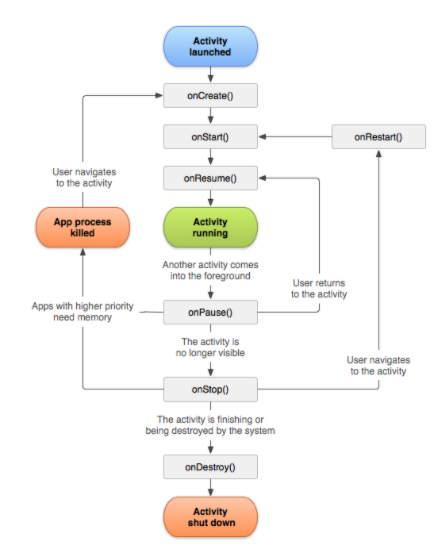 onStop(): This is called when the activity is no longer visible to the user but is also not destroyed. The lifecycle goes from this state to onStart() when the activity is made visible again an example of this state being initiated is when the user minimizes the app.