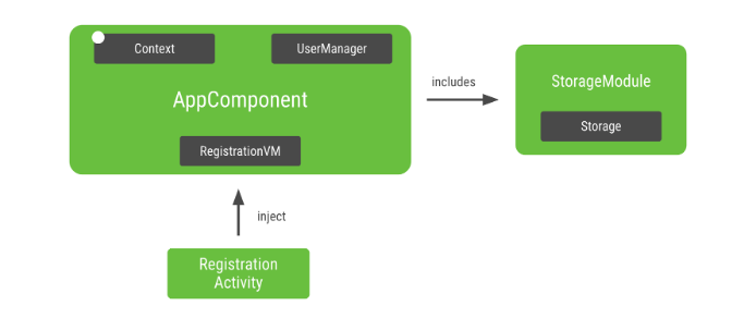 }With the inject(activity: RegistrationActivity) method in the @Component interface, we're telling Dagger that RegistrationActivity requests injection and that it has to provide the dependencies which are annotated with @Inject (i.e. RegistrationViewModel as we defined in the previous step)