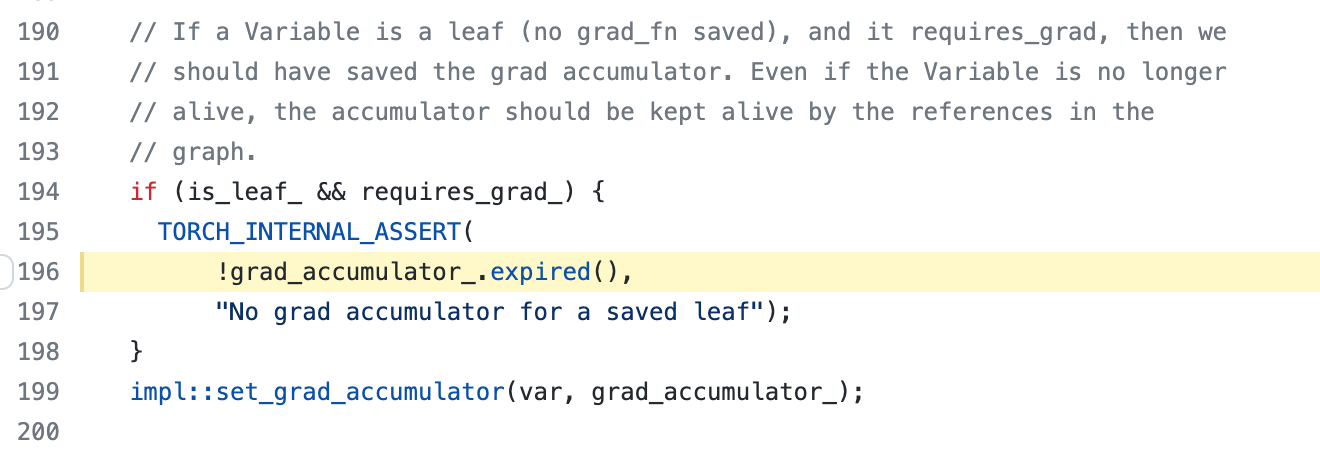 ctx.save_for_backward. In torch autograd function, we need to provide either inputs or intermediate values toctx.save_for_backward. However, whenactivation_offload=True, the current implementation will copy the tensors to cpu, creating new tensors which are neither inputs or intermediate activations (i.e. does not have gradient accumulator objects associated with them).This will trigger the assertion statement as shown below.