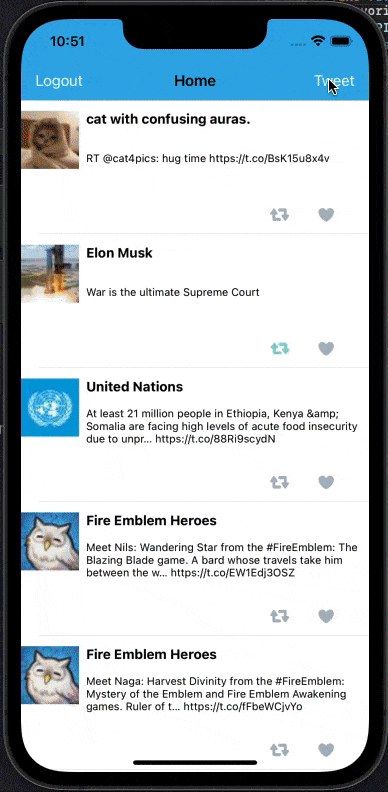 - User can view tweets with the user profile picture, username, and tweet text. (6pts)