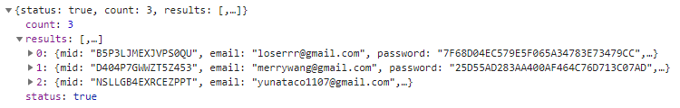 • APP_KEY相符 且 SQL語法執行成功 -> 回傳 status = true 及查詢結果