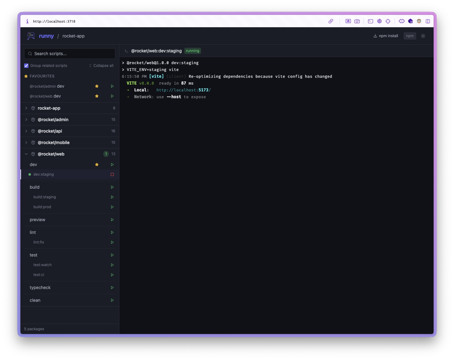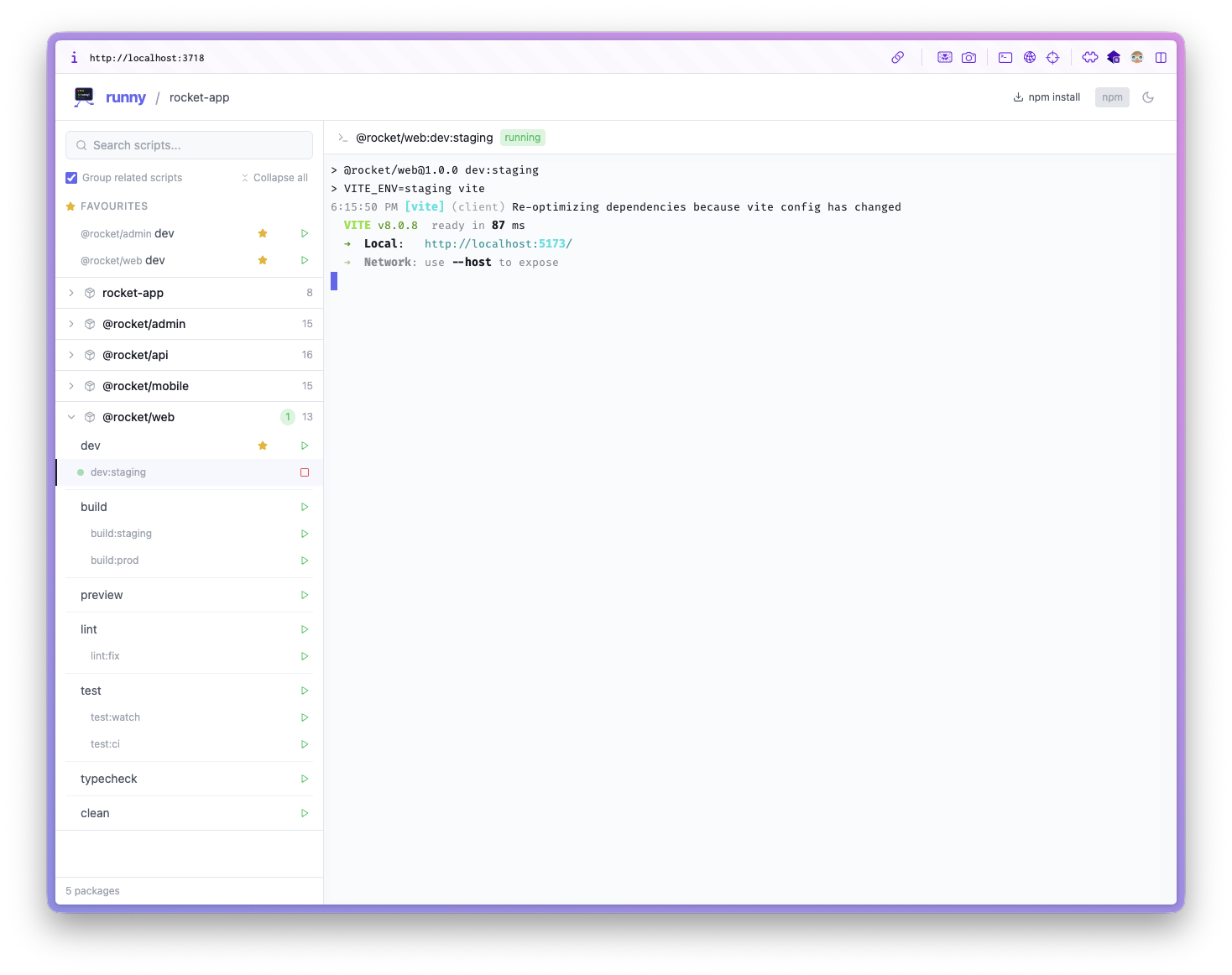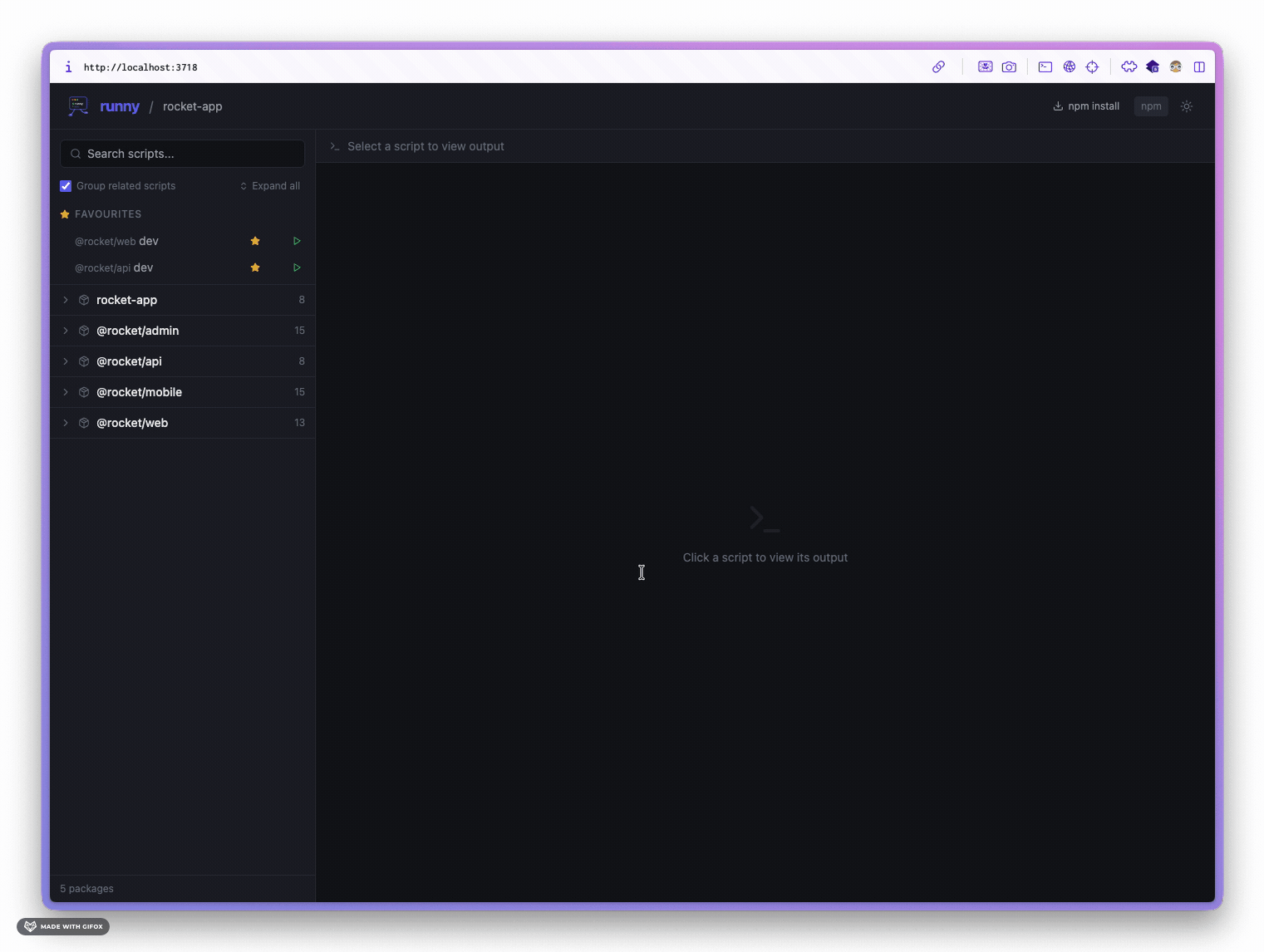 package.jsonfiles based on your workspace config - A React frontend opens in your browser showing all discovered scripts