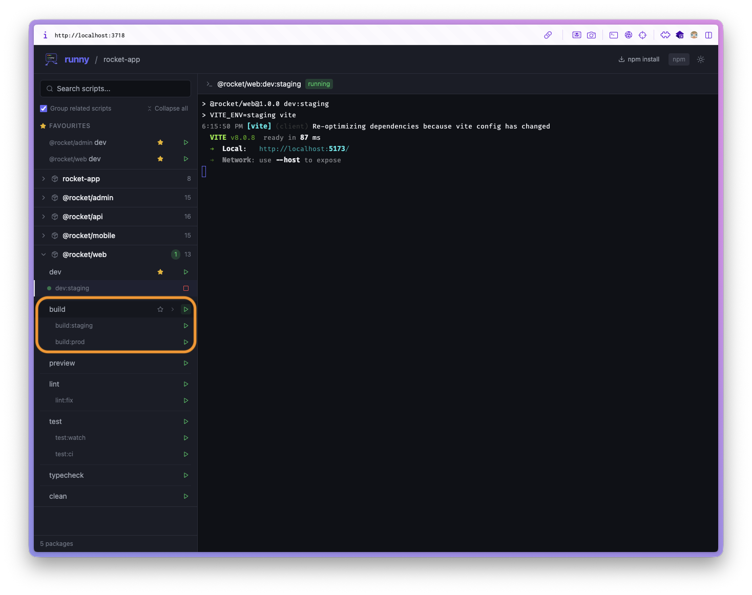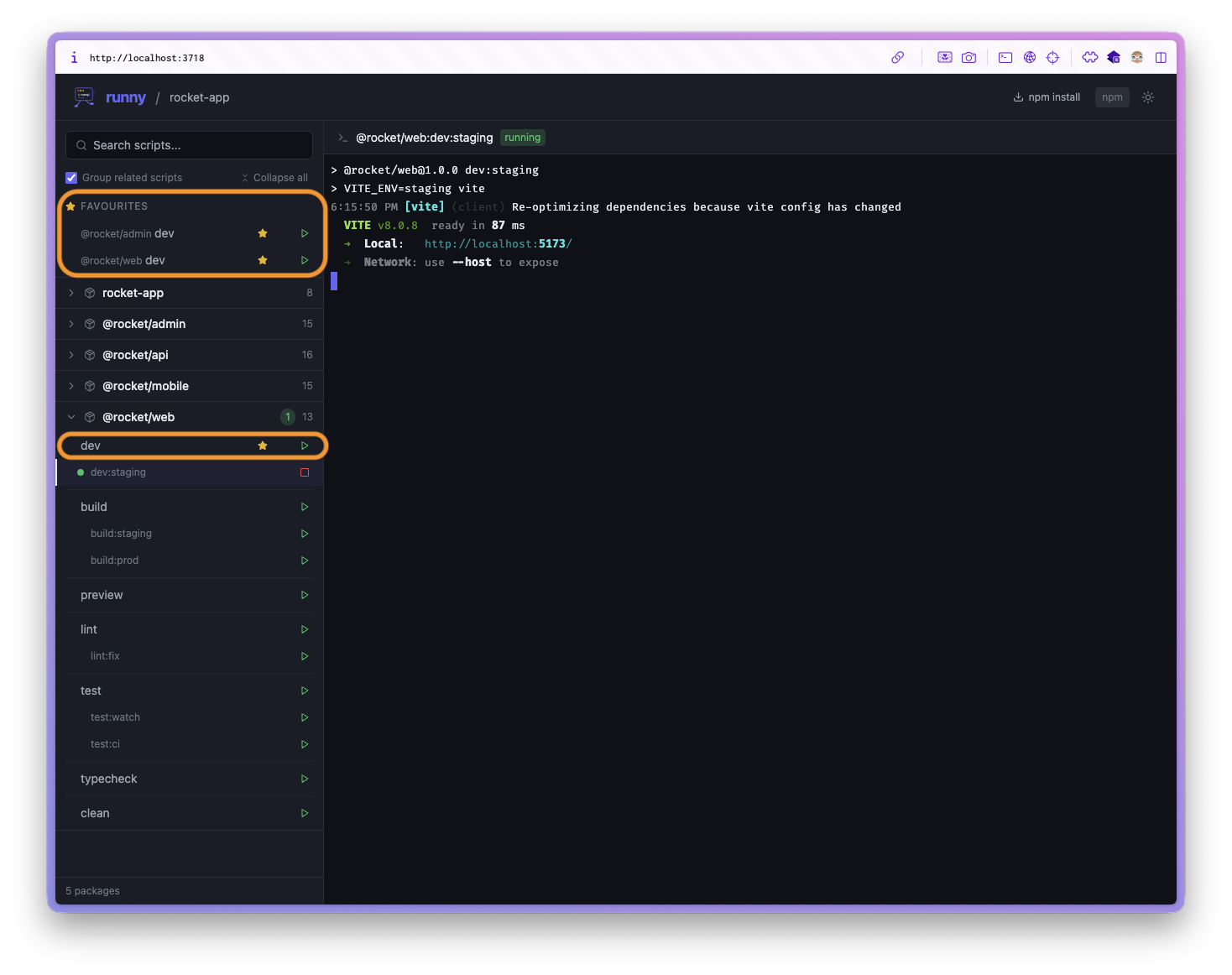 test,test:ci,test:dev) are visually grouped together - Favourites — Star your most-used scripts for quick access across all packages