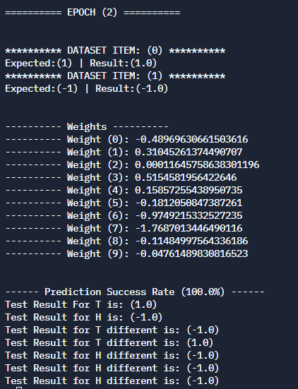 Precepton code example, differentiating a matrix that contains a drawing of T and H.