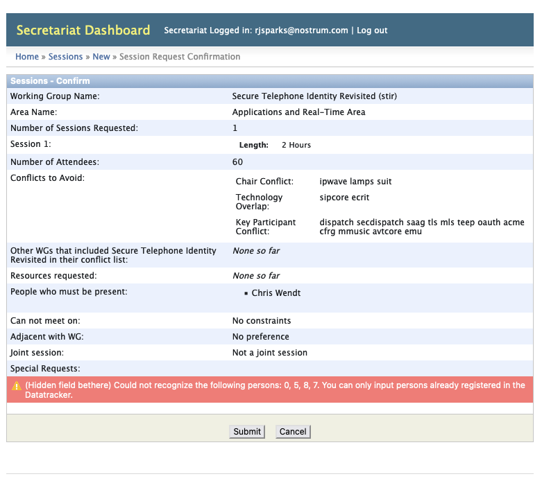 After requesting info from IETF-113, Error Message for "bethere" said Chairs were not recognized in Datatracker. I pressed submit anyway and the Session request submission failed.
