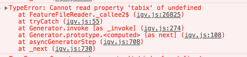 That commit fixes the above issue with the artifacts. For the "Cannot read property 'tabix' of undefined" message, it also occurs when a user/auth token doesn't have permissions to access a particular file. |