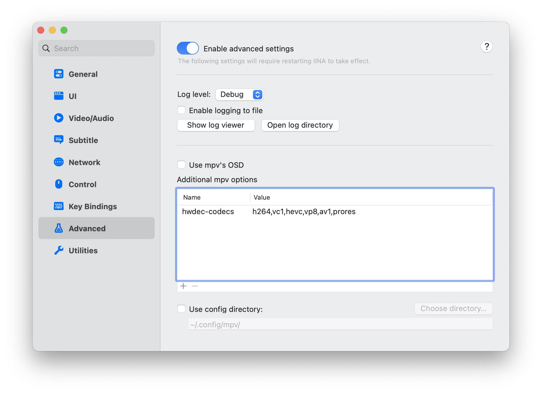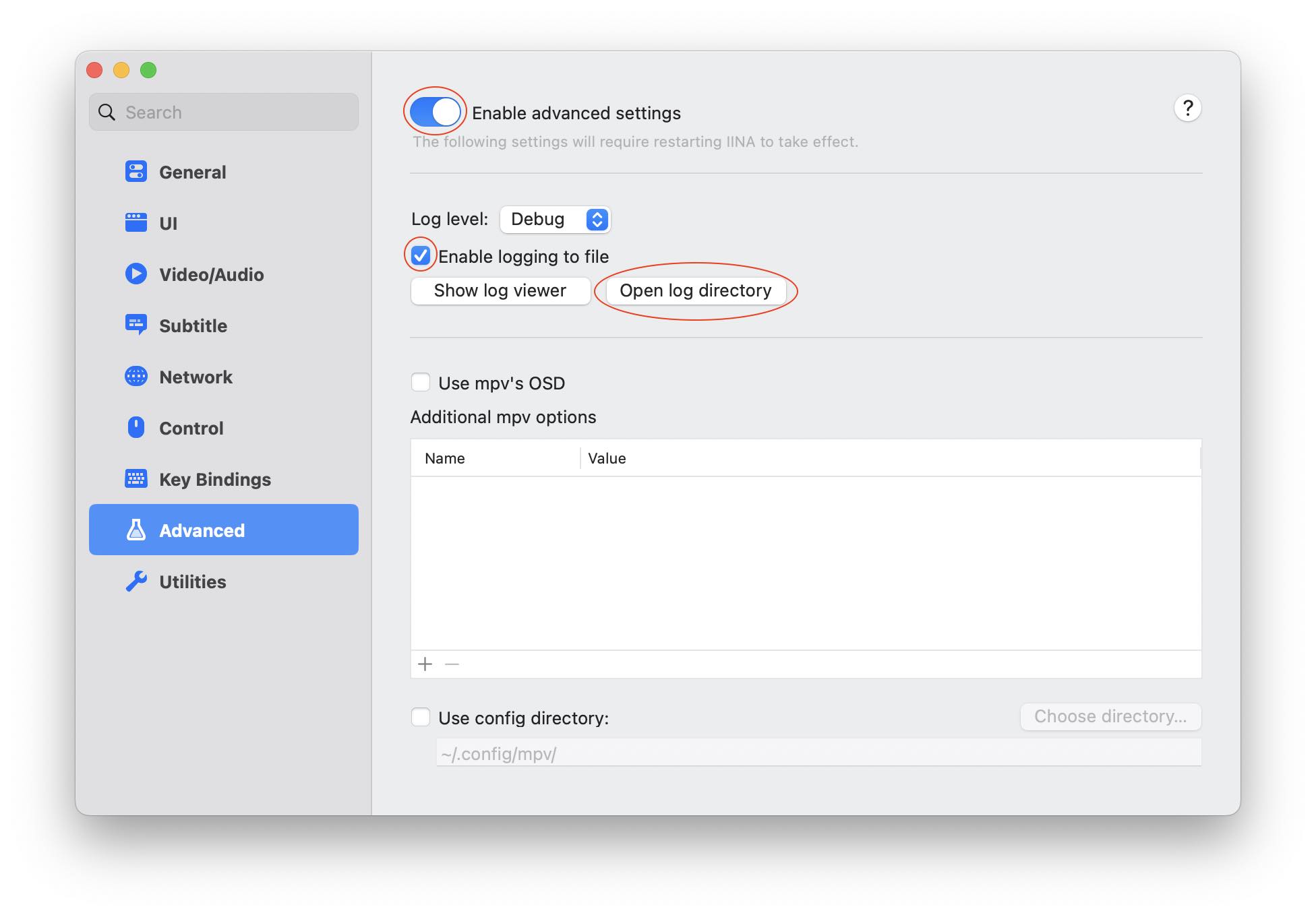 I added some mpv options to the watch list in the IINA settings. Will those do? If they won't I'd like to know how to enable mpv logging. |