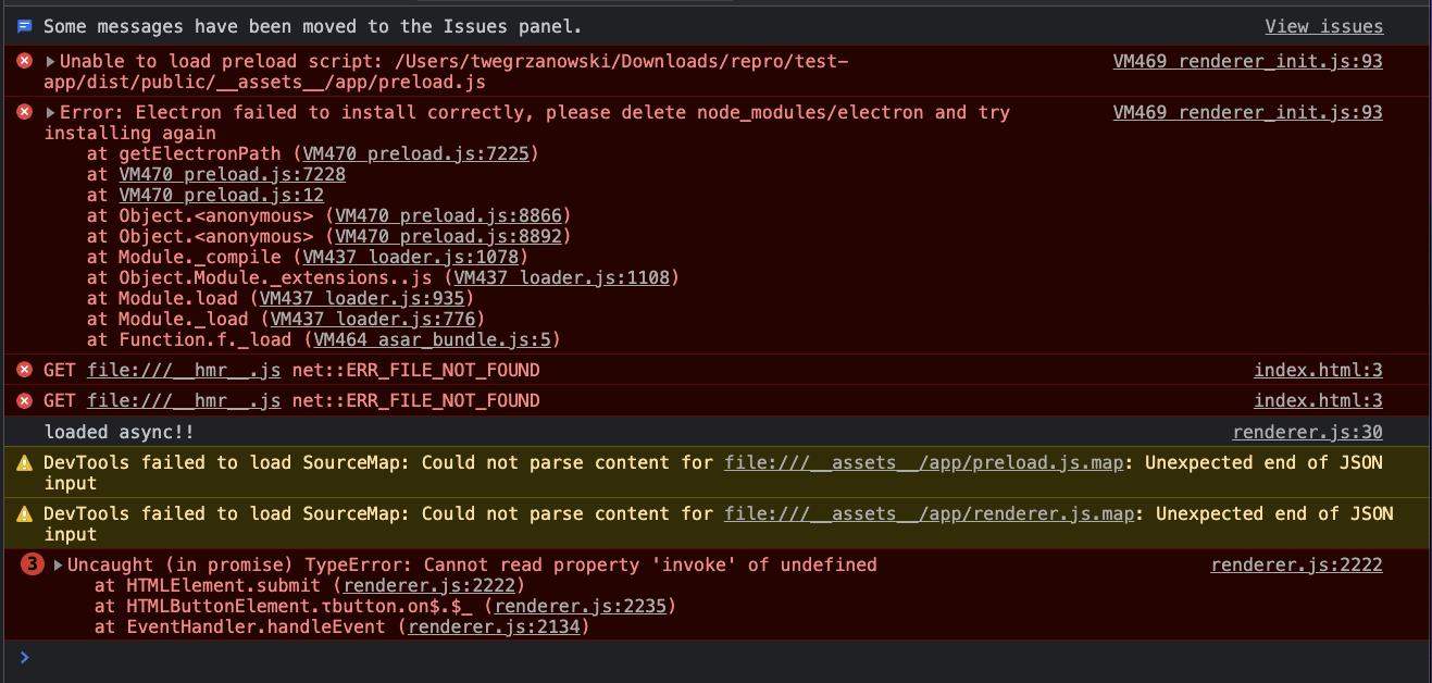 index.htmlexpects__hmr__.jswhich is not there (separate from preload issue)DevTools failed to load SourceMap: Could not parse content for file:///__assets__/app/preload.js.map: Unexpected end of JSON input- those paths are wrong (separate from preload issue)Uncaught (in promise) TypeError: Cannot read property 'invoke' of undefined- because preload did not run, button does thisI think figuring out why preload is crashing and fixing it would be the main thing. Bad parts to hmr, source maps, and minor things are probably not blocking development.