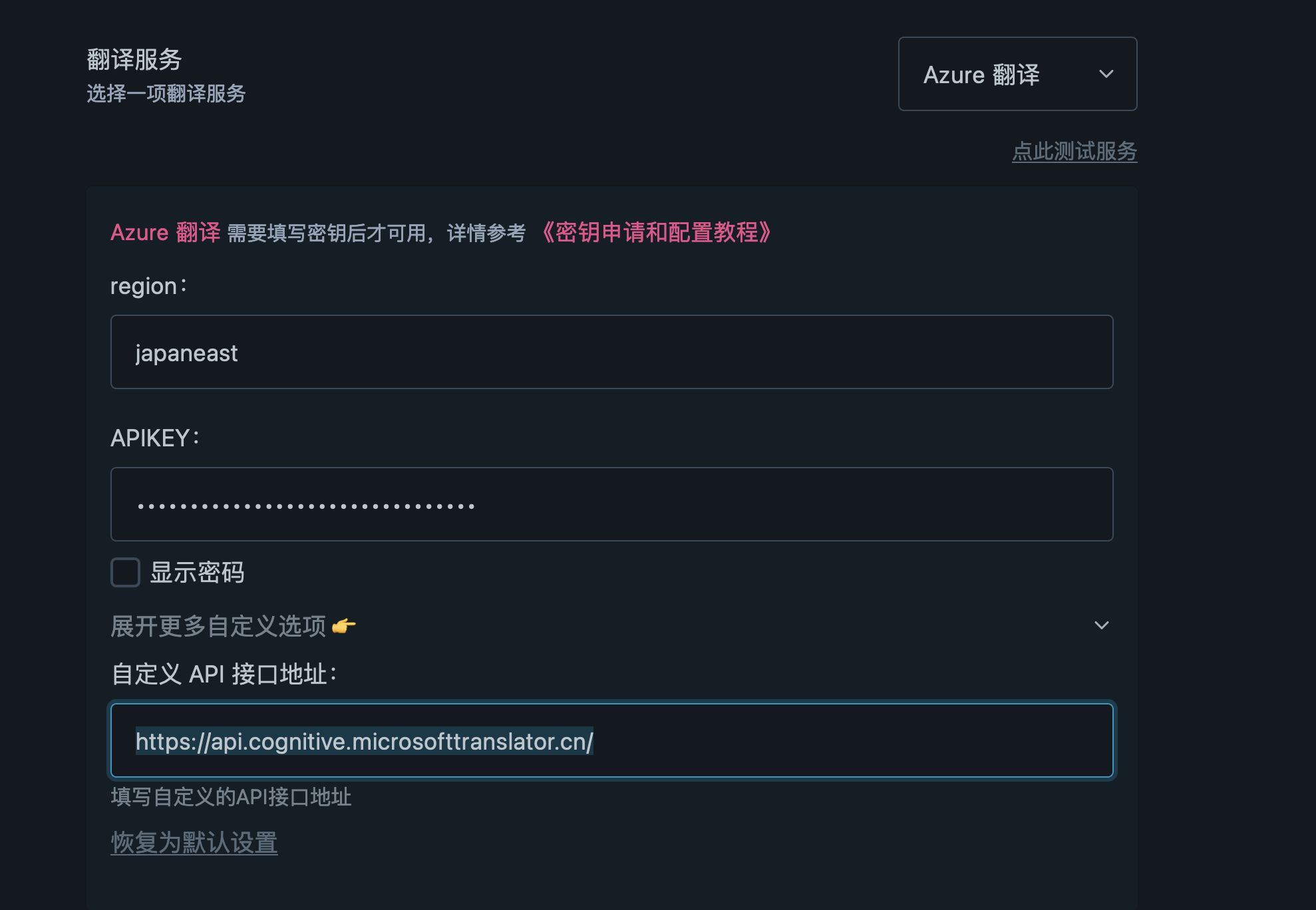 如果 Azure 翻译能支持自定义的终结点(API 地址)就更好了。