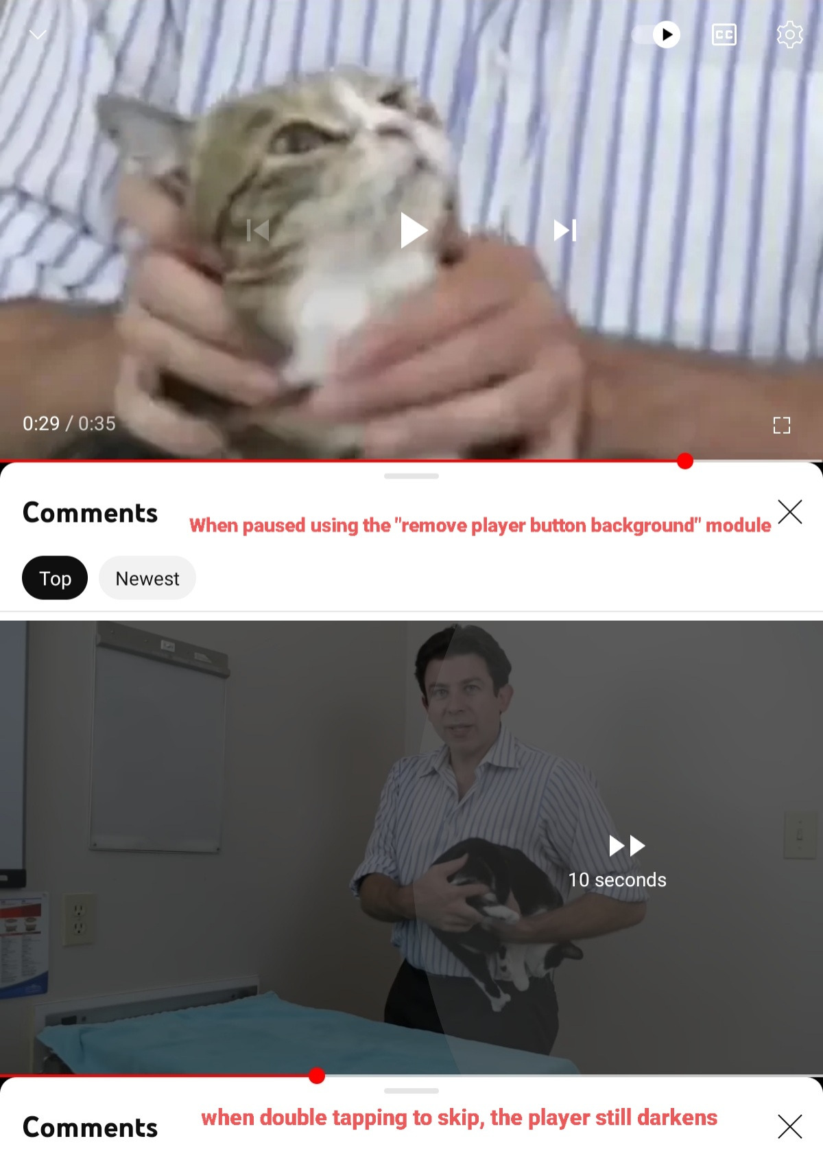 When double tapping to skip 10 seconds the video briefly darkens. Enabling 'remove player button background' does not remove the player background when double tapping to skip. Another patch can add in this feature. Thanks for considering.