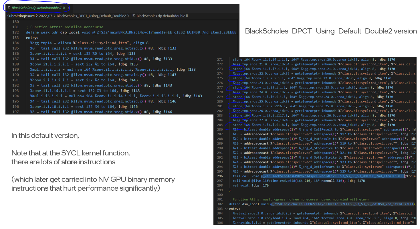 - [Discovered reason] using sycl::double2 generates lots of additional memory instructions in LLVM IR, which then get carried into final NV binary (more details below), that degrades performance significantly