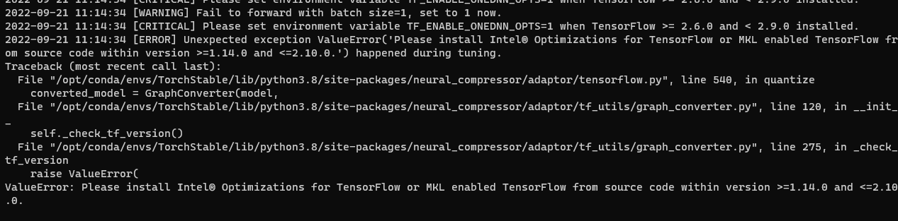 Please install Intel® Optimizations for TensorFlow or MKL enabled TensorFlow from source code within version >=1.14.0 and <=2.1