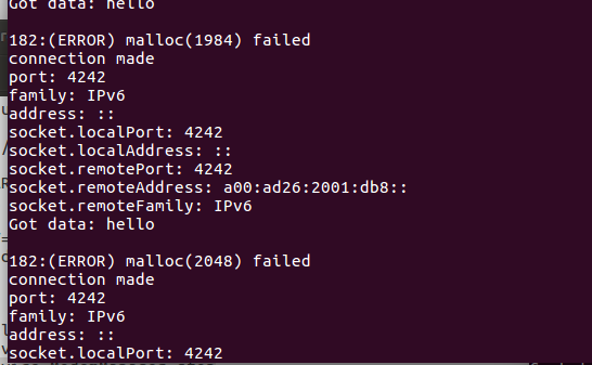 TCPServer6 got error "malloc failed" first, then hangs. cannot receive data from python client, cannot reconnect with python client again.