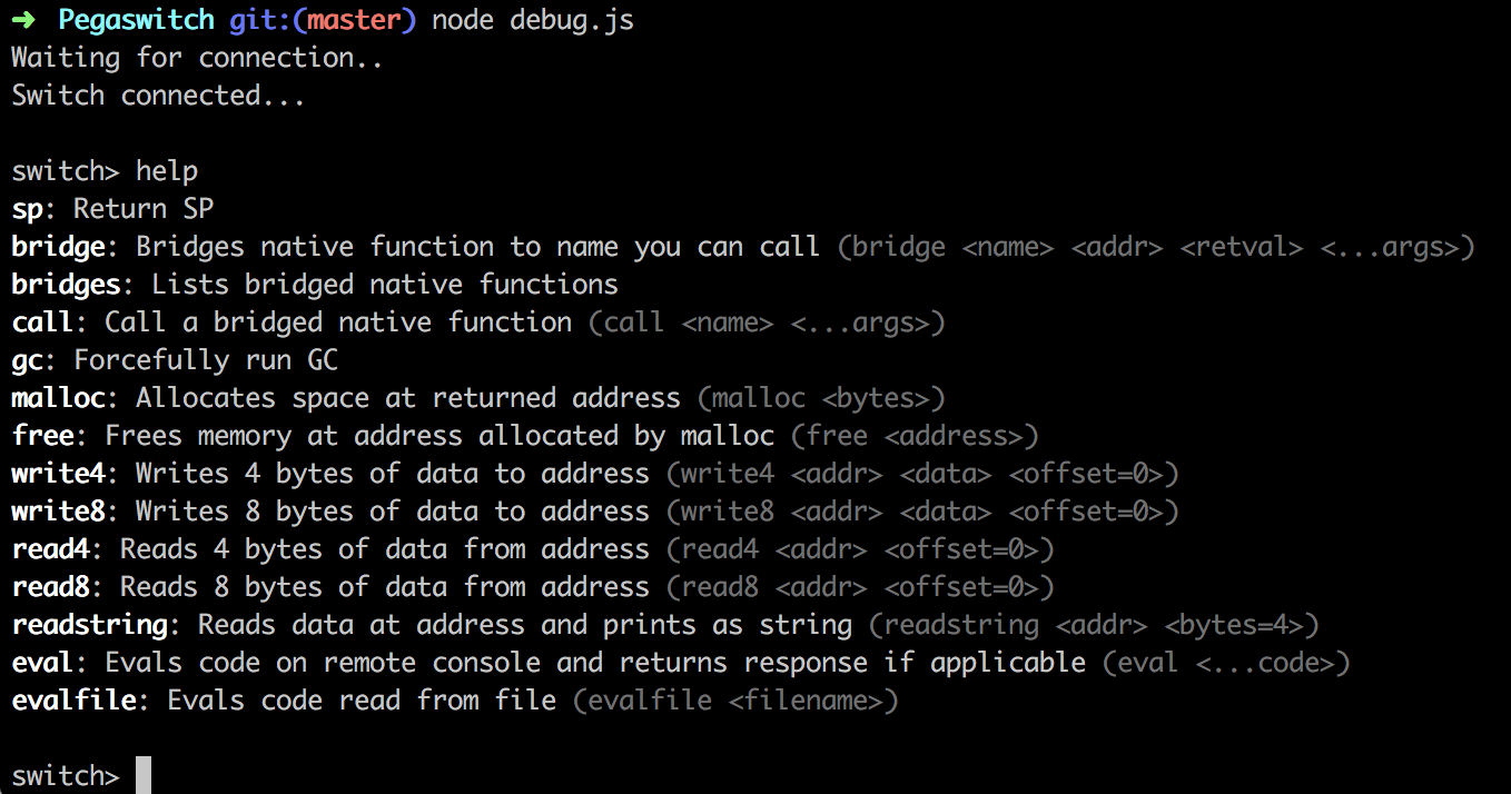 The default way to work with PegaSwitch is via the shell. Type help after the Switch connects to get a list of commands.