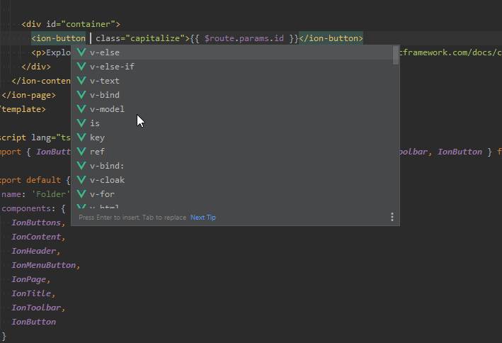 BUT! When I remove IonButton from "components" property, I'm getting both, component (props, events) and Vue (directives, etc) suggestions.
