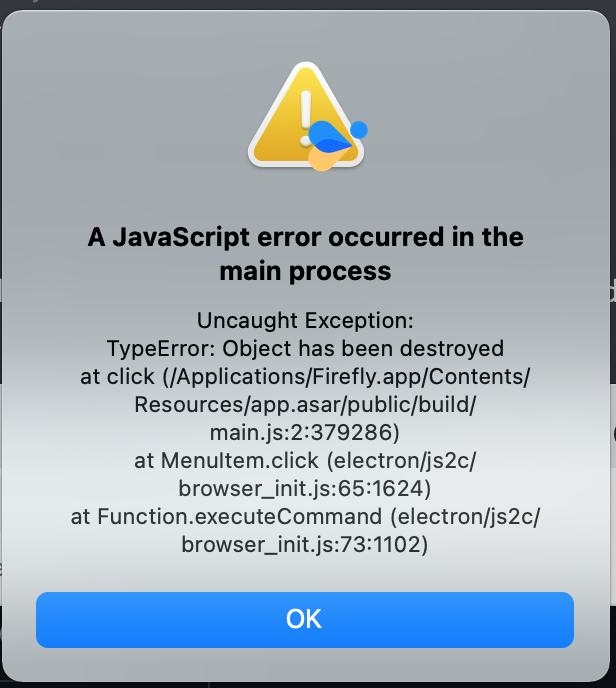 When the FF menu is closed the application is still running on Mac. When I click on any of the FireFly menu options it returns a TypeScript uncaught exception. For example clicking on error logs, check for update, about firefly, etc etc..
