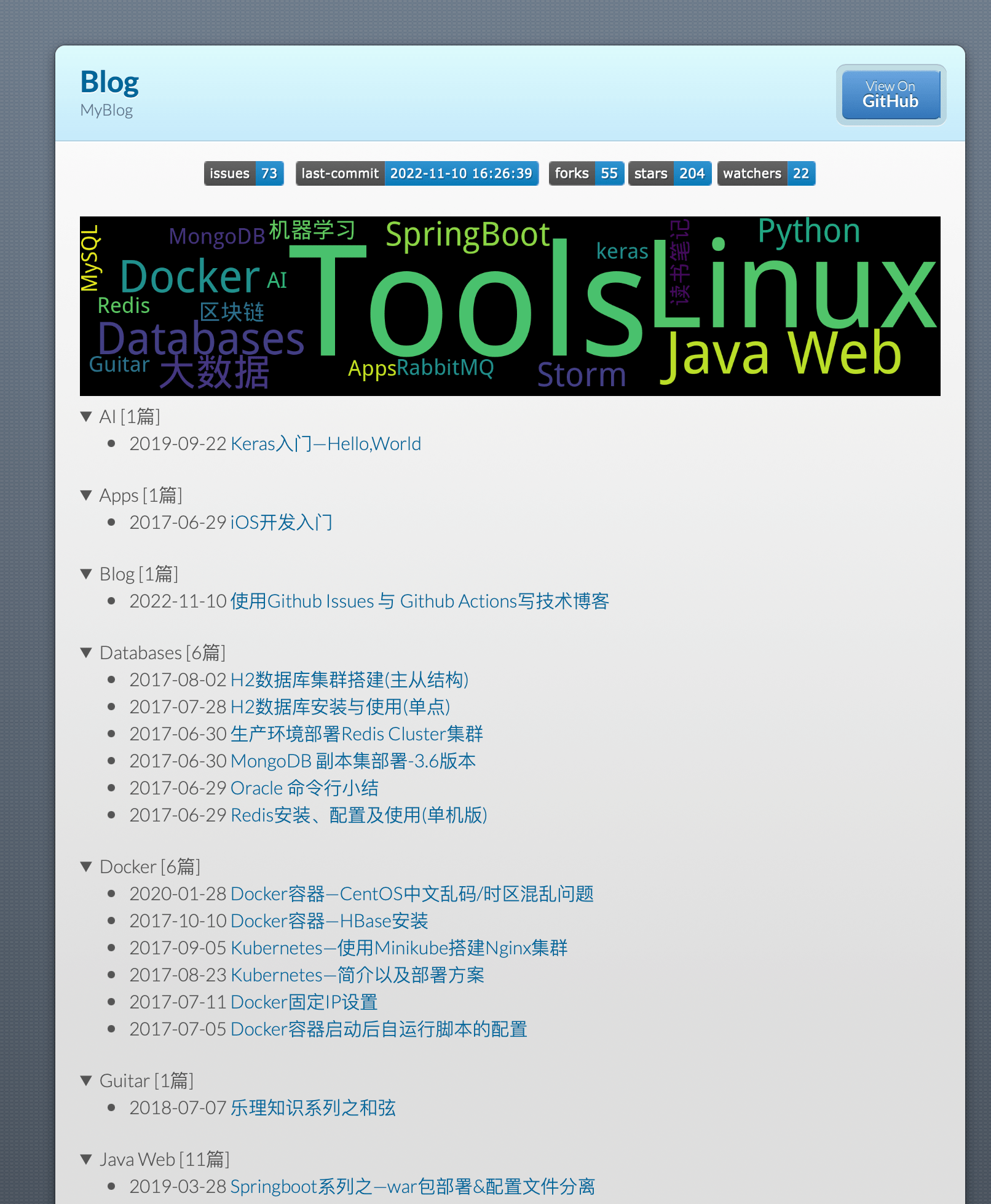 近期发现Github Issues写博客,可以结合 Github Actions做自动化,实现一个效果是:写了一篇博客之后,按照Issues的标签分类,自动更新博客的Readme.md文件,并且自动更新Github Page站点页面。