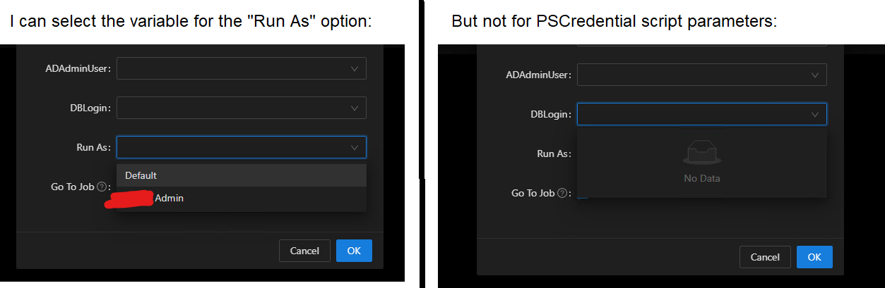 )and I thought I could declare Secrets (variables) and then select these from a drop-down for all [PSCredential] parameters.