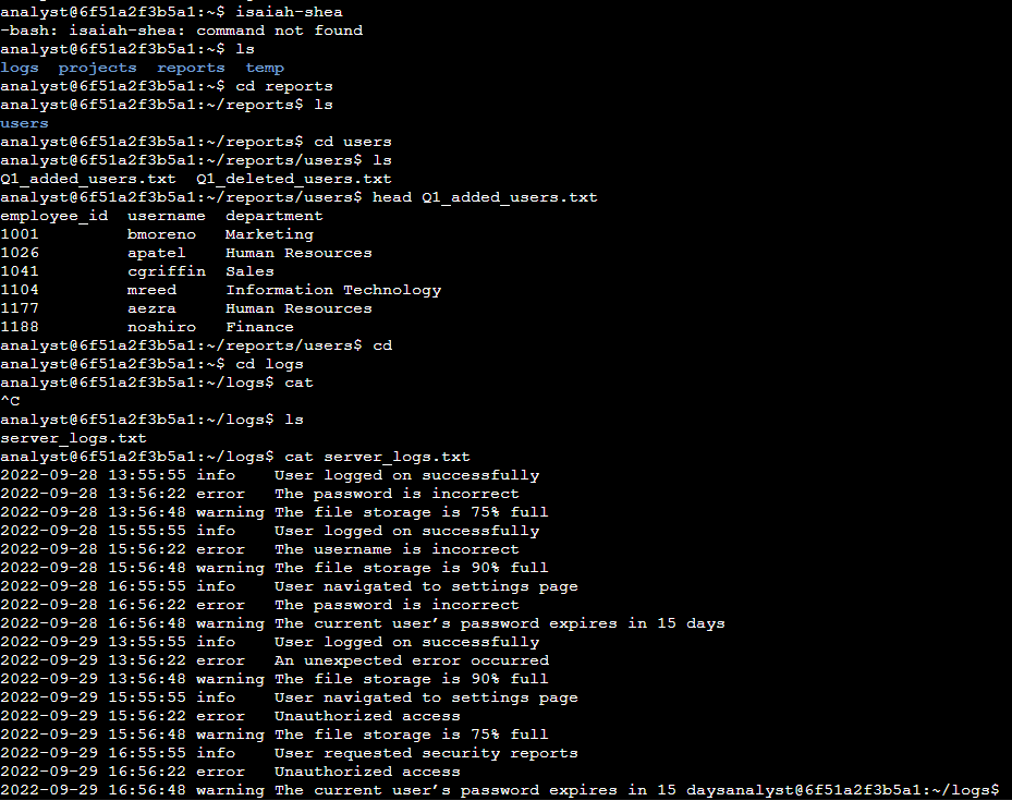 Throughout the lab, I showcased my ability to remotely manage and analyze files via a Linux shell, a critical skill for a security I operating without a graphical user interface. I strategically located specific files, thoroughly examined their contents, and answered multiple-choice questions based on the insights derived from these files. This experience underscores my competence as a security I, highlighting my capacity to navigate, manage, and analyze files remotely in a Linux environment—a skill set crucial for any cybersecurity professional.
