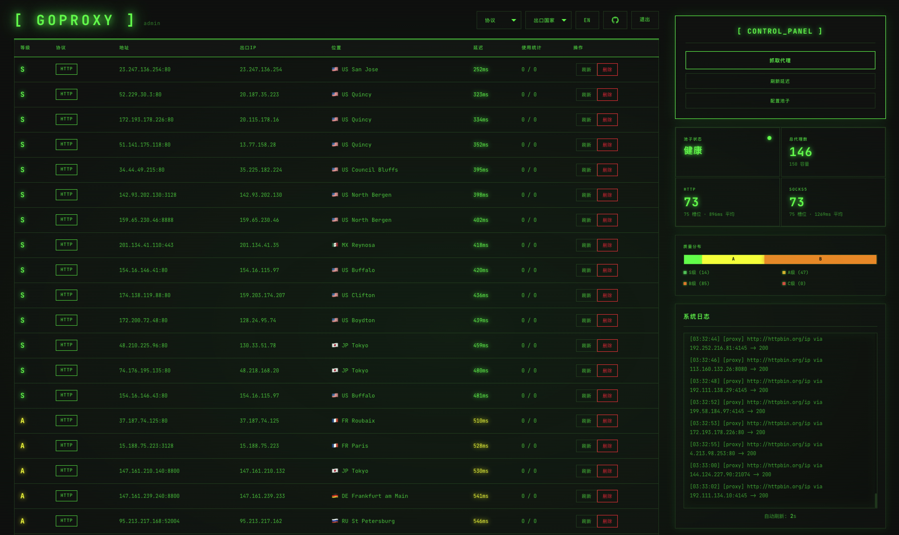 • 代理注册表:详细展示地址、出口 IP、位置、延迟、质量等级、使用统计