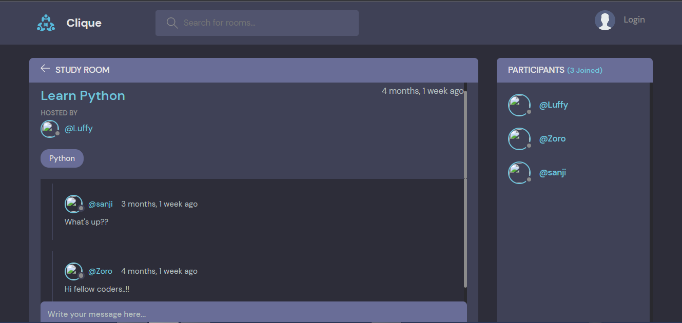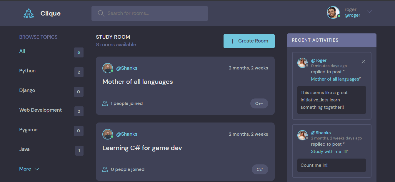 Clique Clique is an online platform for coders to learn and discuss different areas of programming in an interactive interface through online chatting.