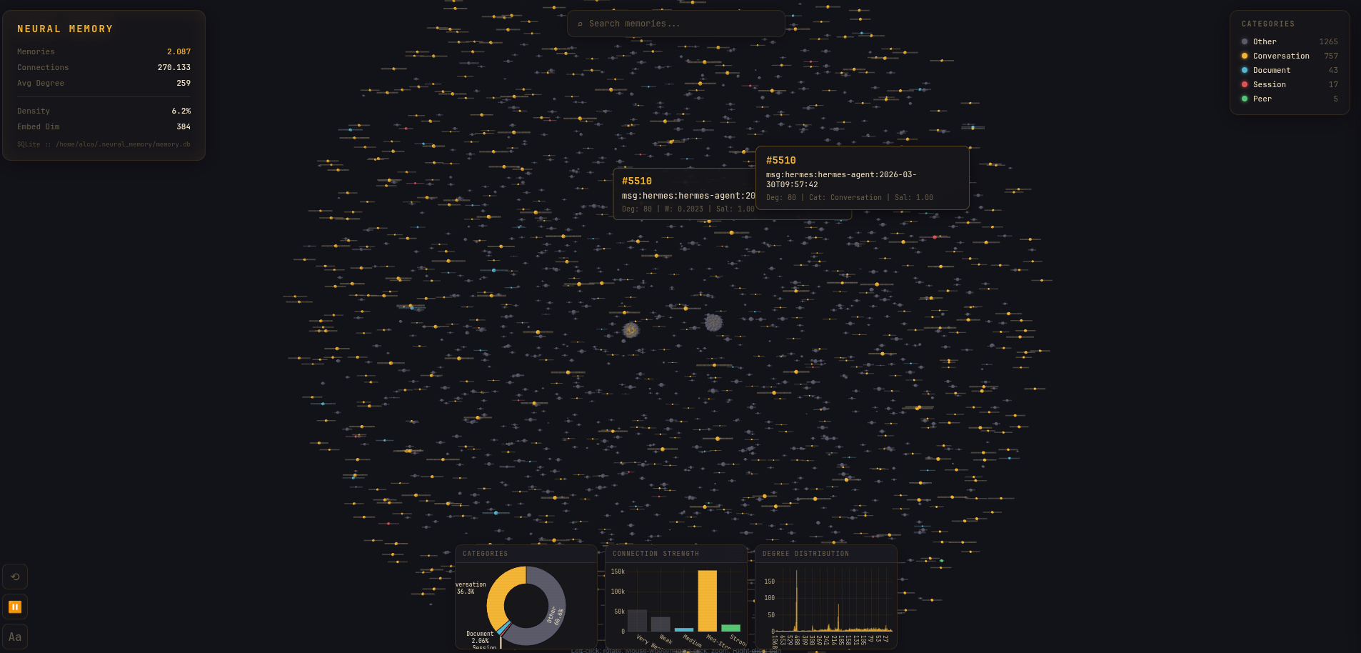 think(start_id). The only path that solves hop-2 retrieval; vanilla cosine literally cannot. - Dream Engine — three-phase autonomous consolidation: NREM (strengthen activated edges + prune weak), REM (bridge isolated memories), Insight (Louvain communities + materialise