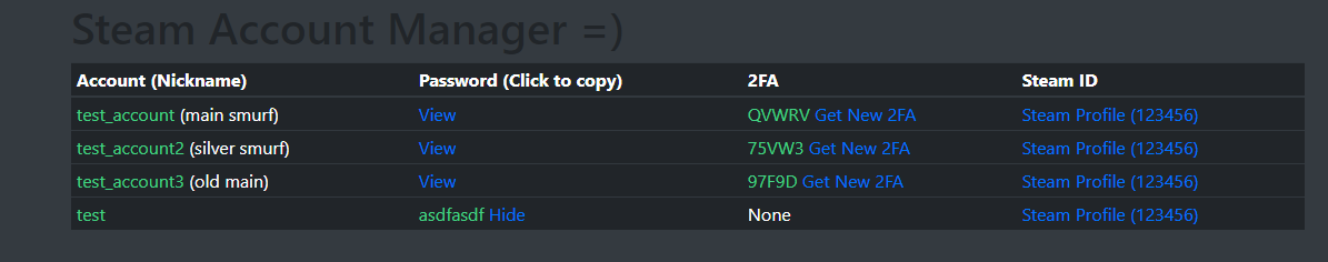 - Accounts now have a password, nickname and steamid stored alongside the identity secret and shared secret.