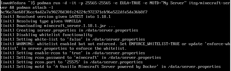 podman run -d -it -p 25565:25565 -e EULA=TRUE -e MOTD="My Server" itzg/minecraft-server