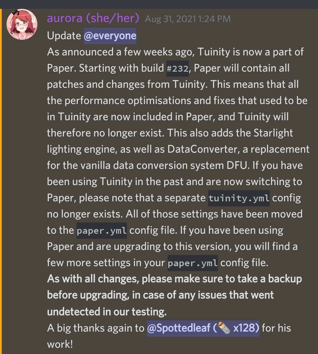 Tuinity has recently been discontinued and adopted by the Paper project. This means that Tuinity is no longer necessary.