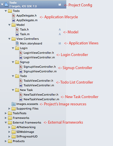 Most of iOS development is done with the MVC design pattern (Model-View Controller) in mind, therefore an application will be divided into Model which contains the classes that contain the data your app will manipulate; View which refers to the visual part of iOS, where you create views to display your data; and Controller which is the middle ground between your data and your views, the controller manipulate the data and display it properly on the views, but will also receive input from the views and convert/manipulate into data.