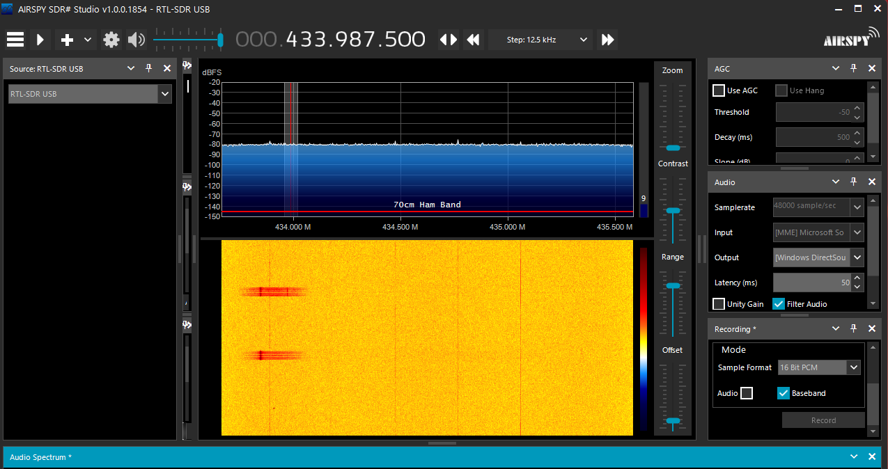 Once we finally had the ability to launch the Rpitx software and demo proper functionality, we were able to begin the attack on the remote control. Using SDR#, we listened at around the range that the remote and receiver were meant to communicate at. By starting in a broad range and tuning in based on actual output, we're able to get a more stable transmission than by simply relying on the manufacturer's stated output.
