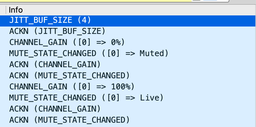 I think (correct me if I'm wrong) all mixing happens on the server side, so that only the final (individual) mix is sent to each client. When I mute somebody in the mix, I just send a message to the server telling it to put client's X gain in my mix to 0. When I solo somebody, I send multiple messages to the server telling it to put all the other clients' gain to 0. Looking at the traffic in Wireshark using the aforementioned Jamulus protocol plugin turning on and off "Solo" on client [1]: Now in this example therei only one other client ([0]), but if there were more, it would send multiple individual BTW: Can anybody confirm my understanding here? Started looking into Jamulus internals only very recently. Cheers! |