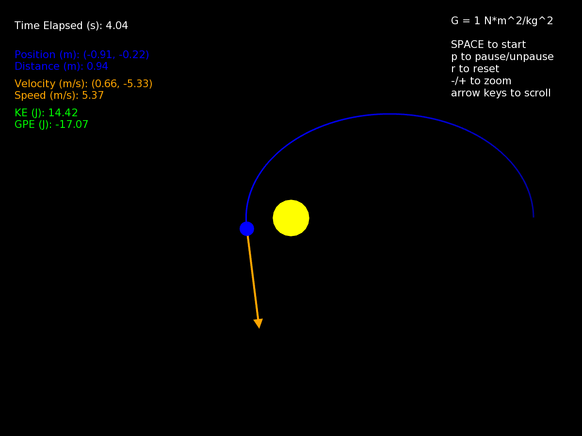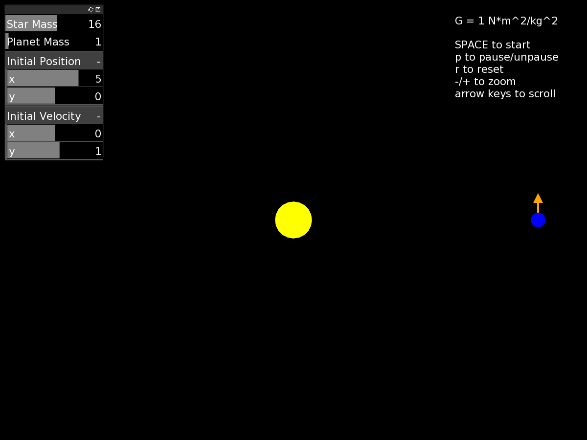 The usage of the application is fairly self-explanatory. Instructions are displayed in the upper-right hand corner. Upon starting the application, the user can adjust parameters such as mass, position, and velocity.