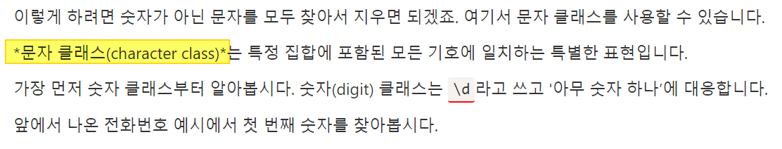 | 이렇게 하려면 숫자가 아닌 문자를 모두 찾아서 지우면 되겠죠. 여기서 문자 클래스를 사용할 수 있습니다. | ||