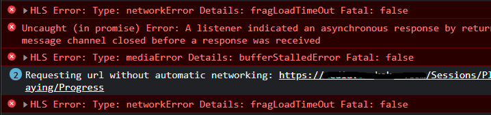 After a few minutes of playback, the player suddenly stops. No useful log message is visible server sided. Client-side logs show that the buffer has stalled. The only way to resume playback is by restarting the player or switching to a different quality, which requires the transcode to restart.