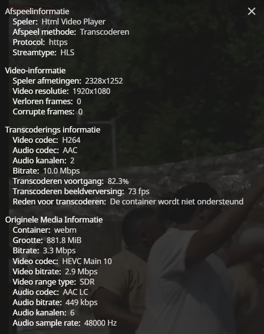 [2022-10-11 14:21:13.818 +02:00] [INF] "/usr/lib/jellyfin-ffmpeg/ffmpeg" "-analyzeduration 200M -ss 00:34:54.000 -f matroska,webm -autorotate 0 -canvas_size 1920x1080 -i file:\"/storage/media/Series/The Blacklist/Season 06/The.Blacklist.S06E04.The.Pawnbrokers.1080p.10bit.BluRay.AAC5.1.HEVC-Vyndros.mkv\" -map_metadata -1 -map_chapters -1 -threads 0 -map 0:0 -map 0:1 -codec:v:0 libx264 -preset veryfast -crf 23 -maxrate 9570100 -bufsize 19140200 -profile:v:0 high -level 51 -x264opts:0 subme=0:me_range=4:rc_lookahead=10:me=dia:no_chroma_me:8x8dct=0:partitions=none -force_key_frames:0 \"expr:gte(t,2094+n_forced*3)\" -sc_threshold:v:0 0 -filter_complex \"[0:3]scale=trunc(min(max(iw\,ih*a)\,min(1920\,1080*a))/2)*2:trunc(min(max(iw/a\,ih)\,min(1920/a\,1080))/2)*2[sub];[0:0]setparams=color_primaries=bt709:color_trc=bt709:colorspace=bt709,scale=trunc(min(max(iw\,ih*a)\,min(1920\,1080*a))/2)*2:trunc(min(max(iw/a\,ih)\,min(1920/a\,1080))/2)*2,format=yuv420p[main];[main][sub]overlay=eof_action=endall:shortest=1:repeatlast=0\" -start_at_zero -codec:a:0 libfdk_aac -ac 2 -ab 384000 -ar 48000 -af \"volume=2\" -copyts -avoid_negative_ts disabled -max_muxing_queue_size 2048 -f hls -max_delay 5000000 -hls_time 3 -hls_segment_type mpegts -start_number 698 -hls_segment_filename \"/storage/media/transcodes/6a8e118c323e27f6aa168833512b9376%d.ts\" -hls_playlist_type vod -hls_list_size 0 -y \"/storage/media/transcodes/6a8e118c323e27f6aa168833512b9376.m3u8\""FFmpeg logs