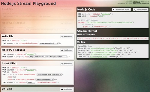 The Node.js Stream Playground was created to help Node.js developers better understand how streams work by showing a number of use cases that are easily plug-and-play-able. Additionally detailed logging is provided at every step to help users better understand what events the streams are emitting and exactly what their contents are.