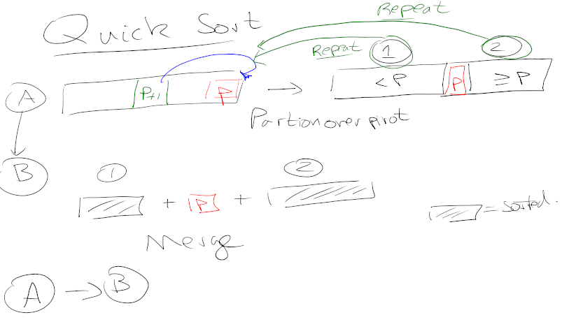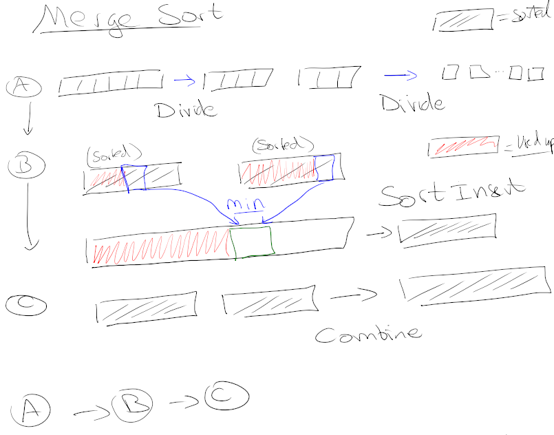 In this section, diagrams explaining the idea behind each sorting algorithm is presented. Additionl comments on the worst time and space complexity are also provided.