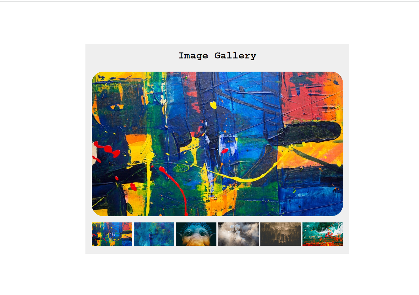 image-gallery 이미지 갤러리 구현 데모 - 정혜수 https://jhs97.github.io/image-gallery/ (url에 제목이 아닌 html문서명으로 저장하기 img-gallery -> index) 기능소개 하단의 썹네일 이미지를 클릭하면 메인 이미지가 변경되는 간단한 갤러리 주요 구현 내용 피그마를 통한 갤러리 와이어 프레임 제작 HTML, CSS 퍼블리싱(UI 구현) 썹네임 이미지를 클릭하면 메인 이미지가 바뀌는 갤러리 사용 라이브러리 -jQuery